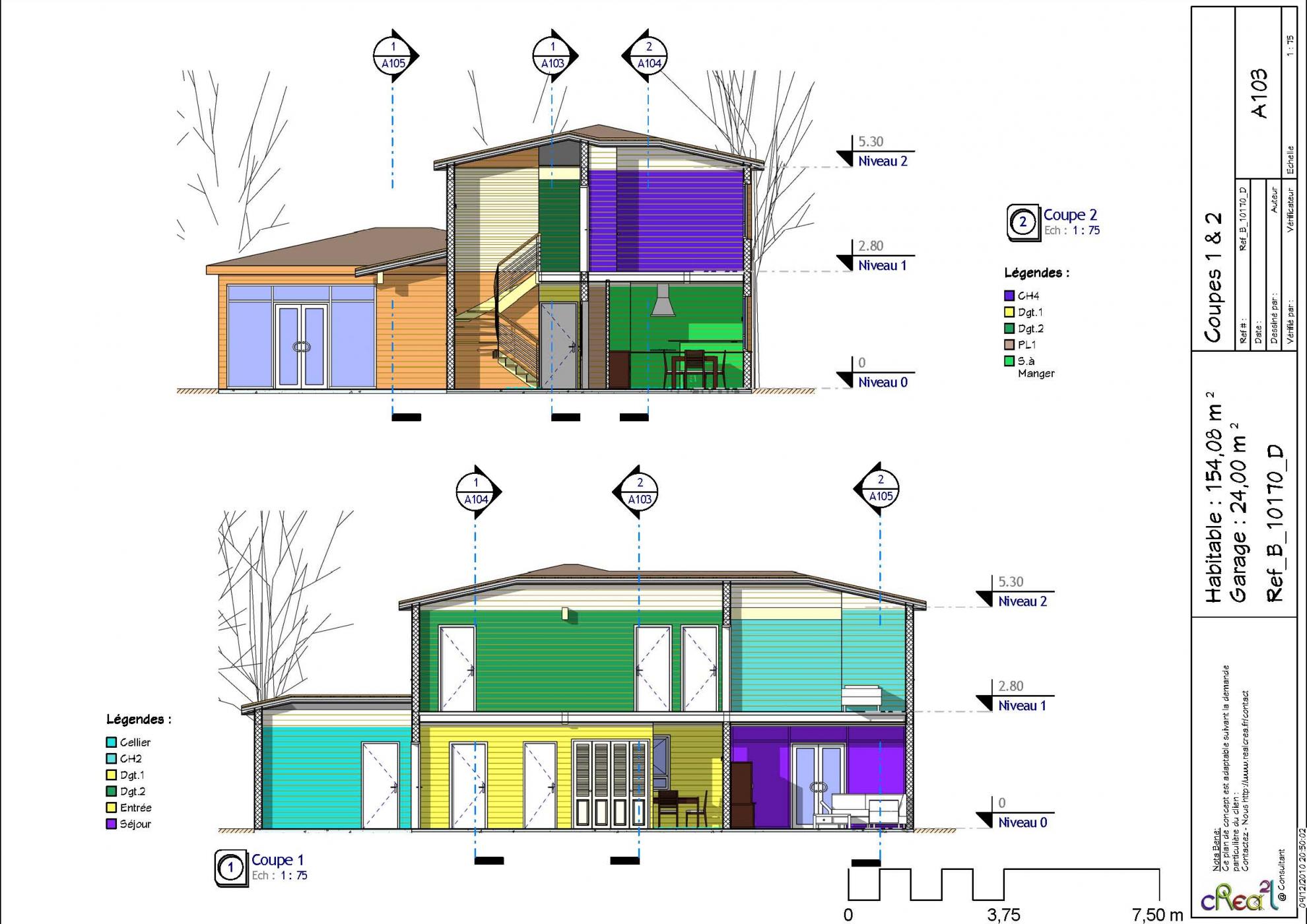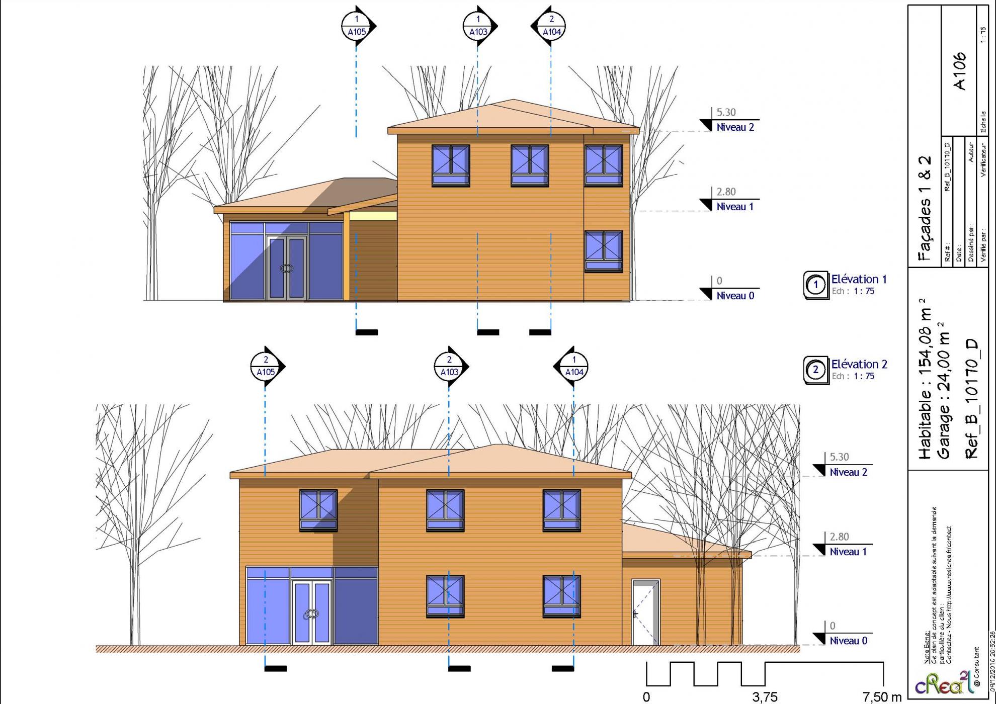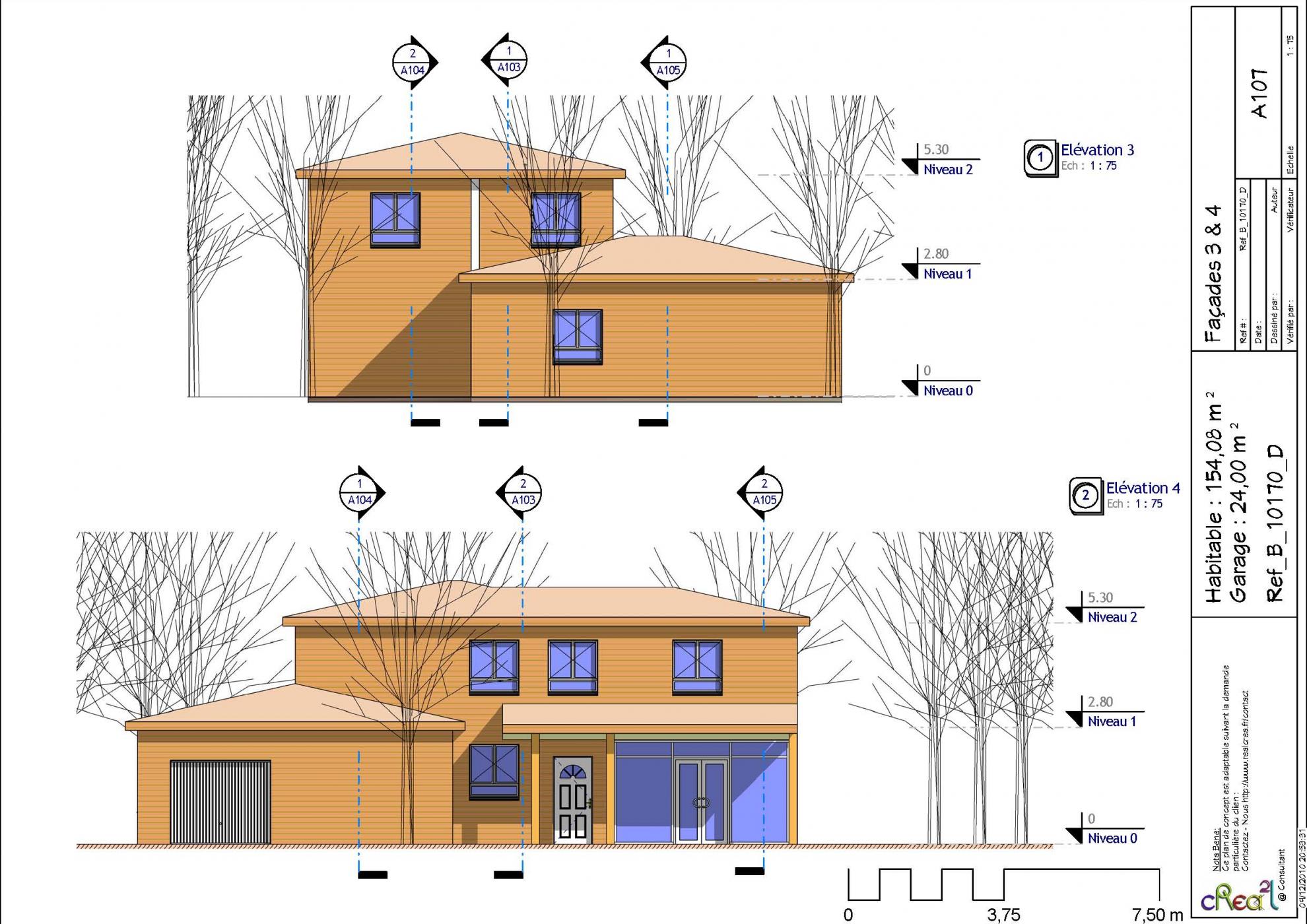 Plan B_10170_D : Maison en bois, 5 chambres, 154 m² habitables + Garage intégré.