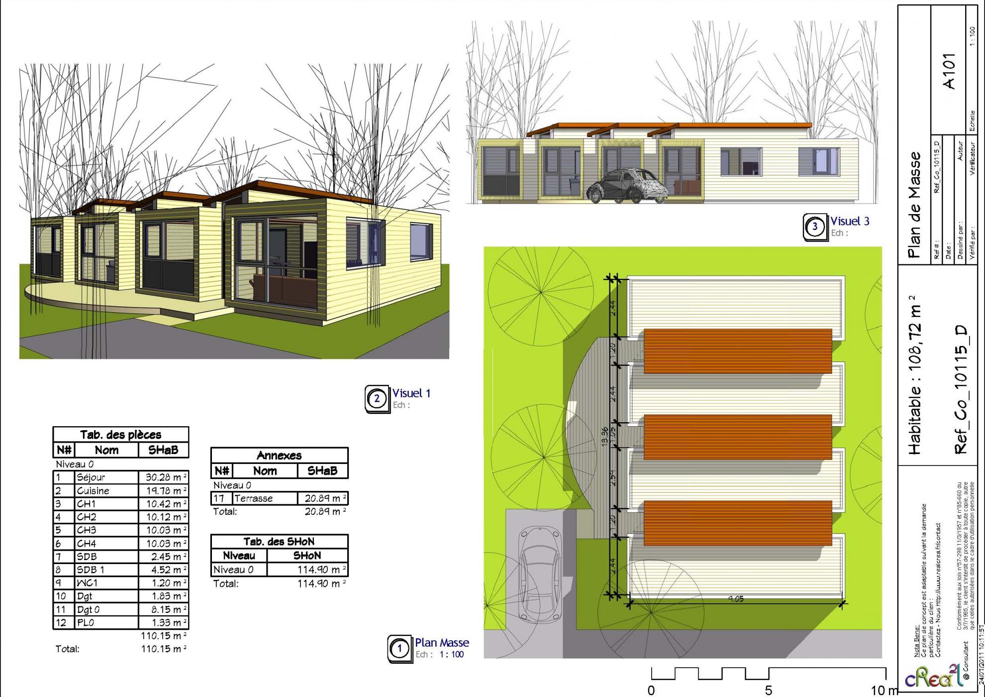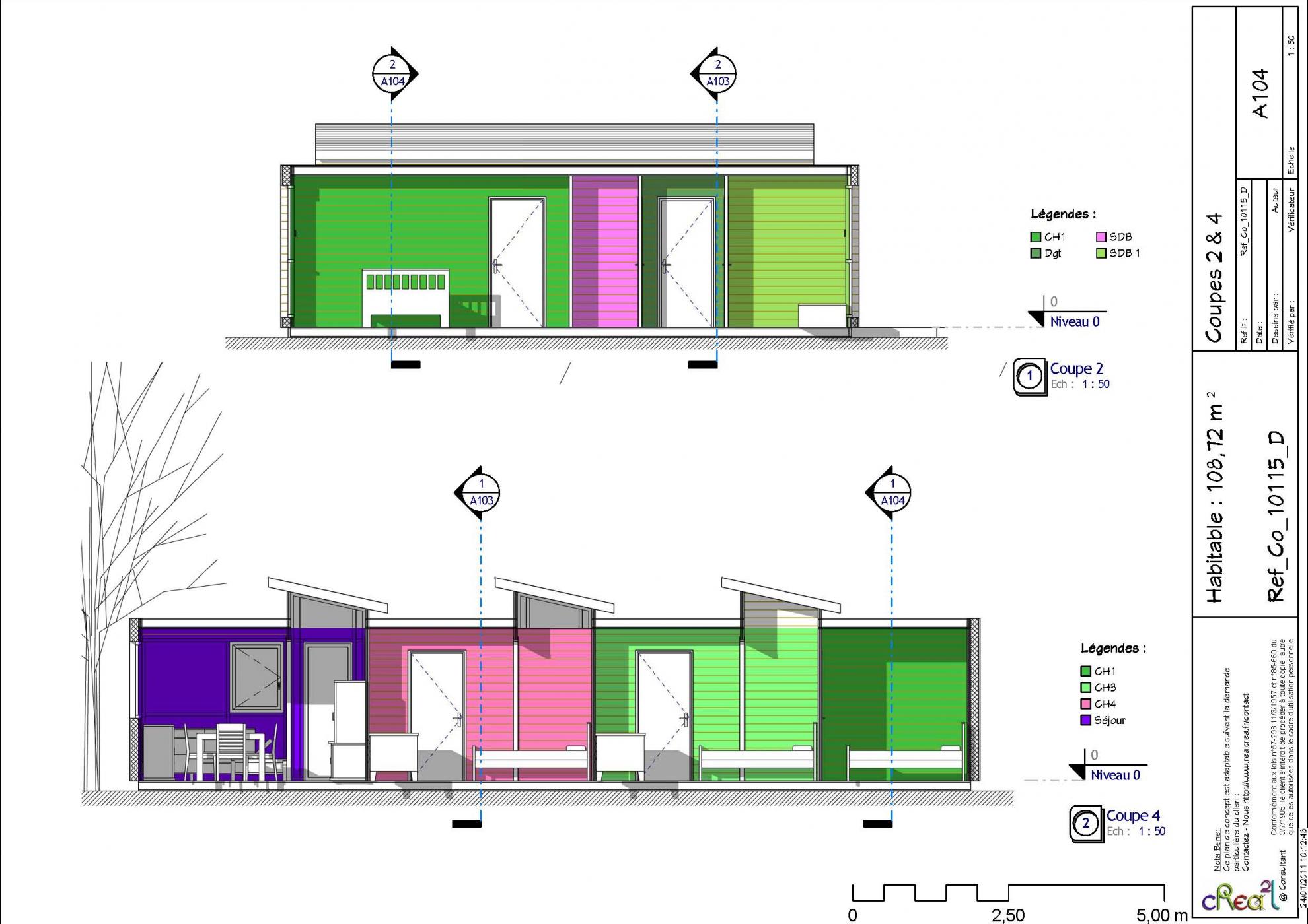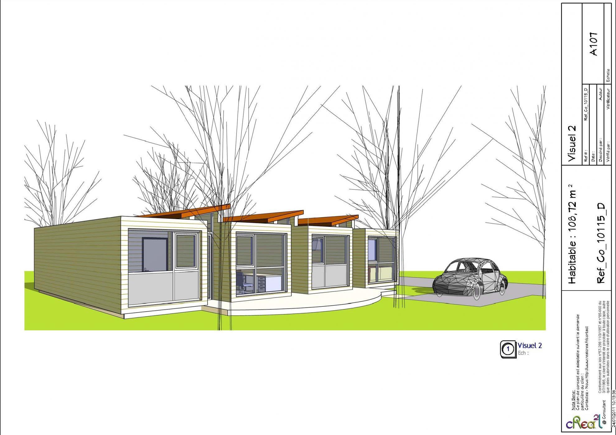 Plan Co_10115_D : Maison container plain-pied, 4 chambres, 108 m² habitables.
