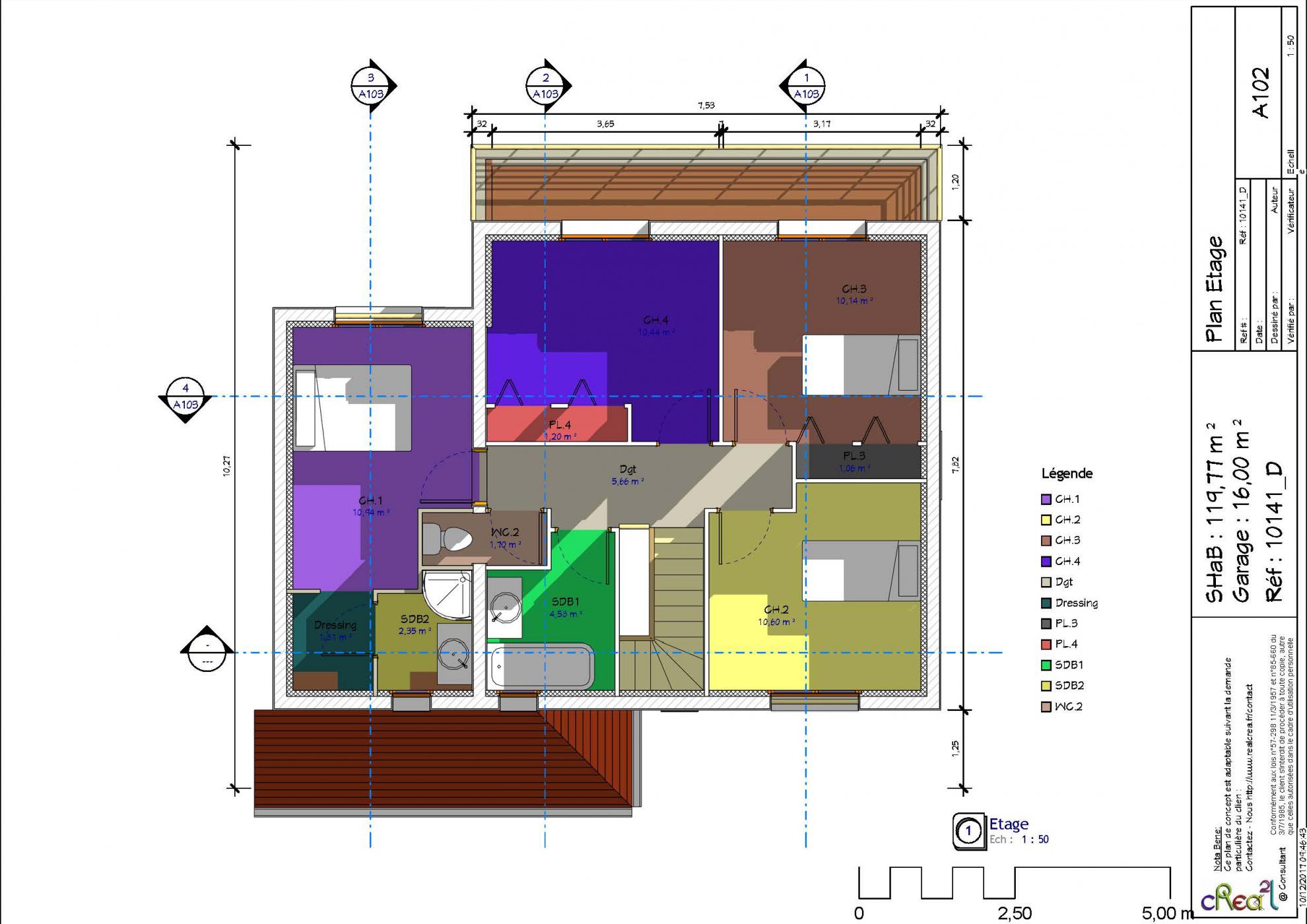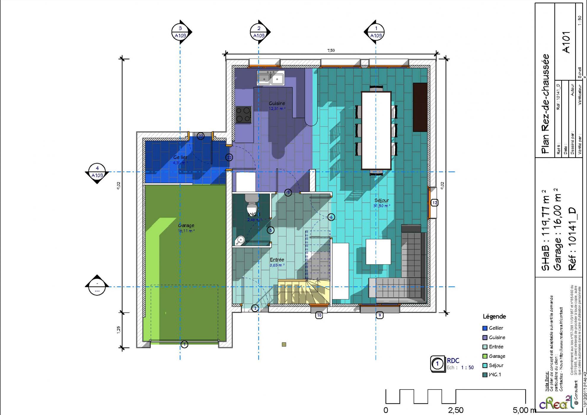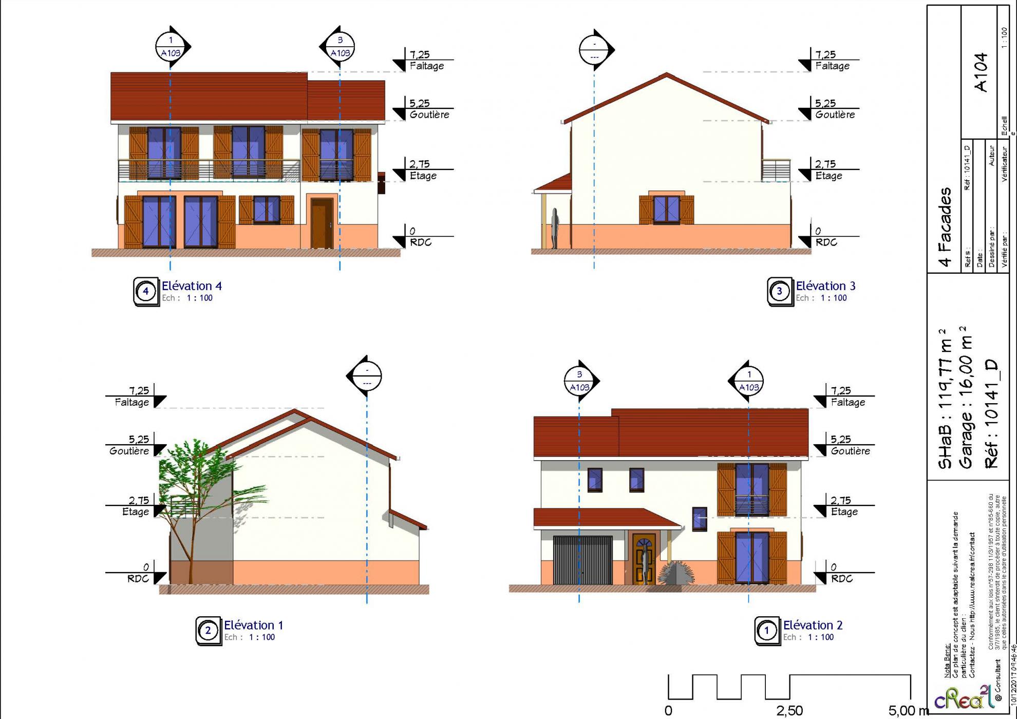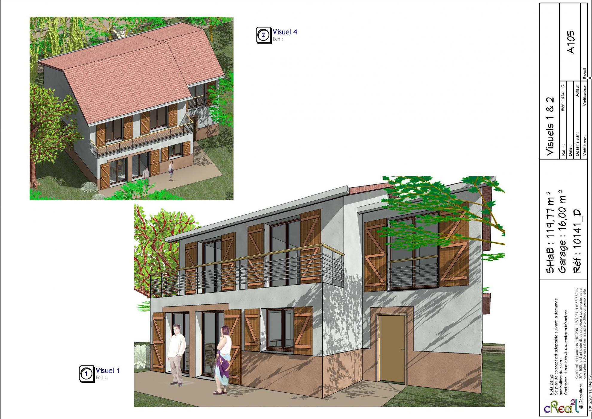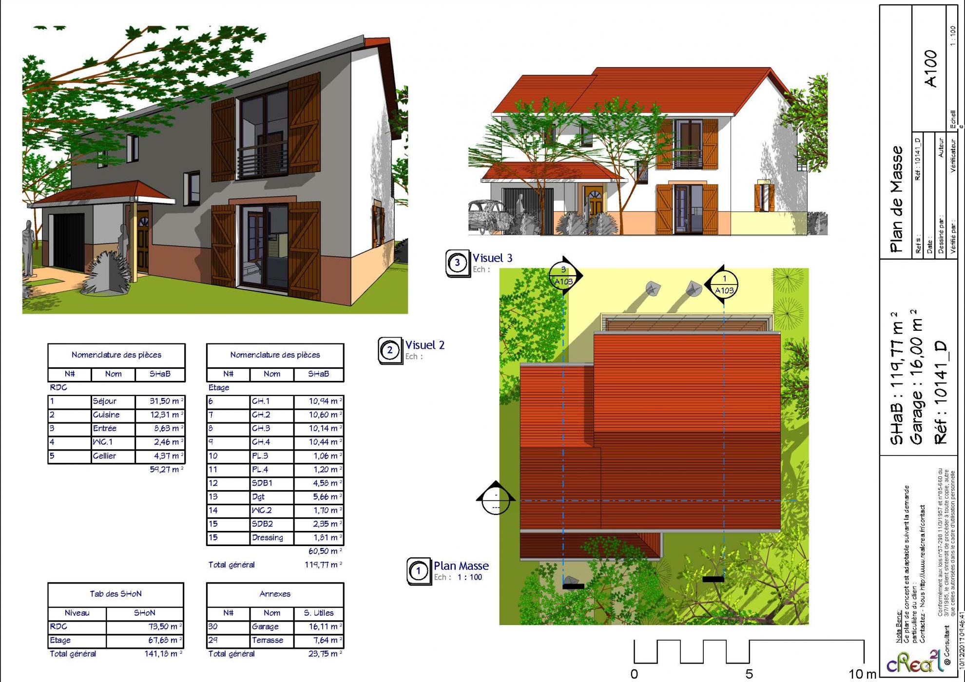 Plan 10141_D : Maison 120 m², 3 chambres, 1 suite parentale + garage intégré.