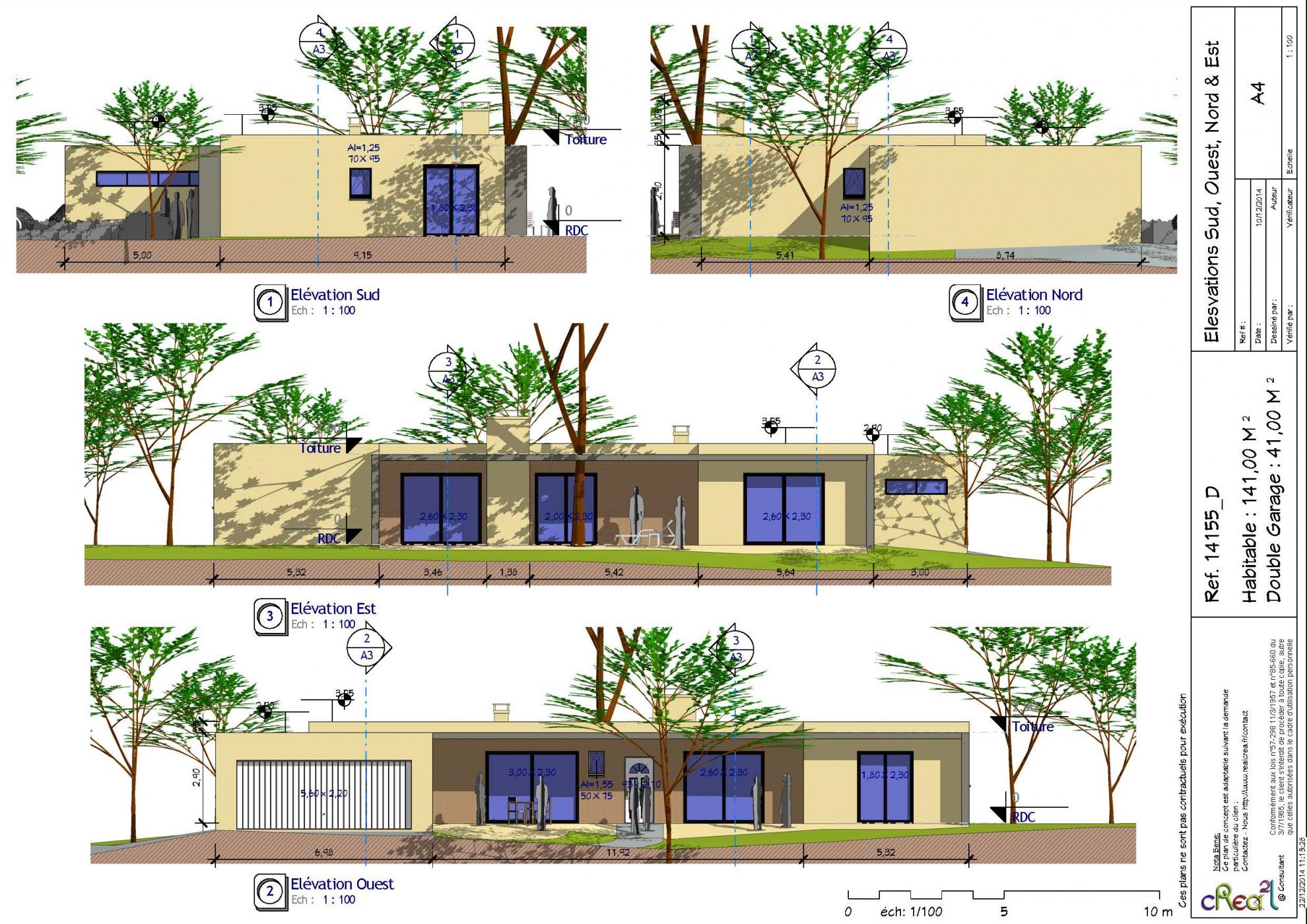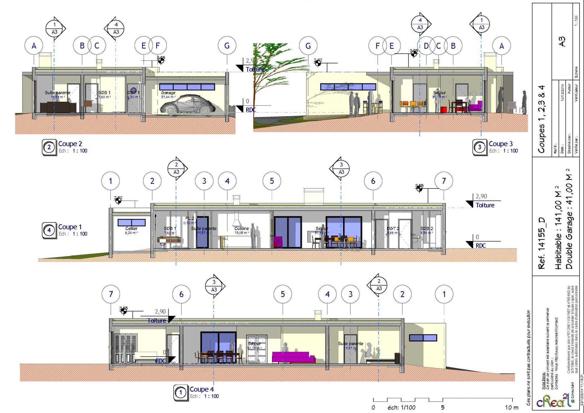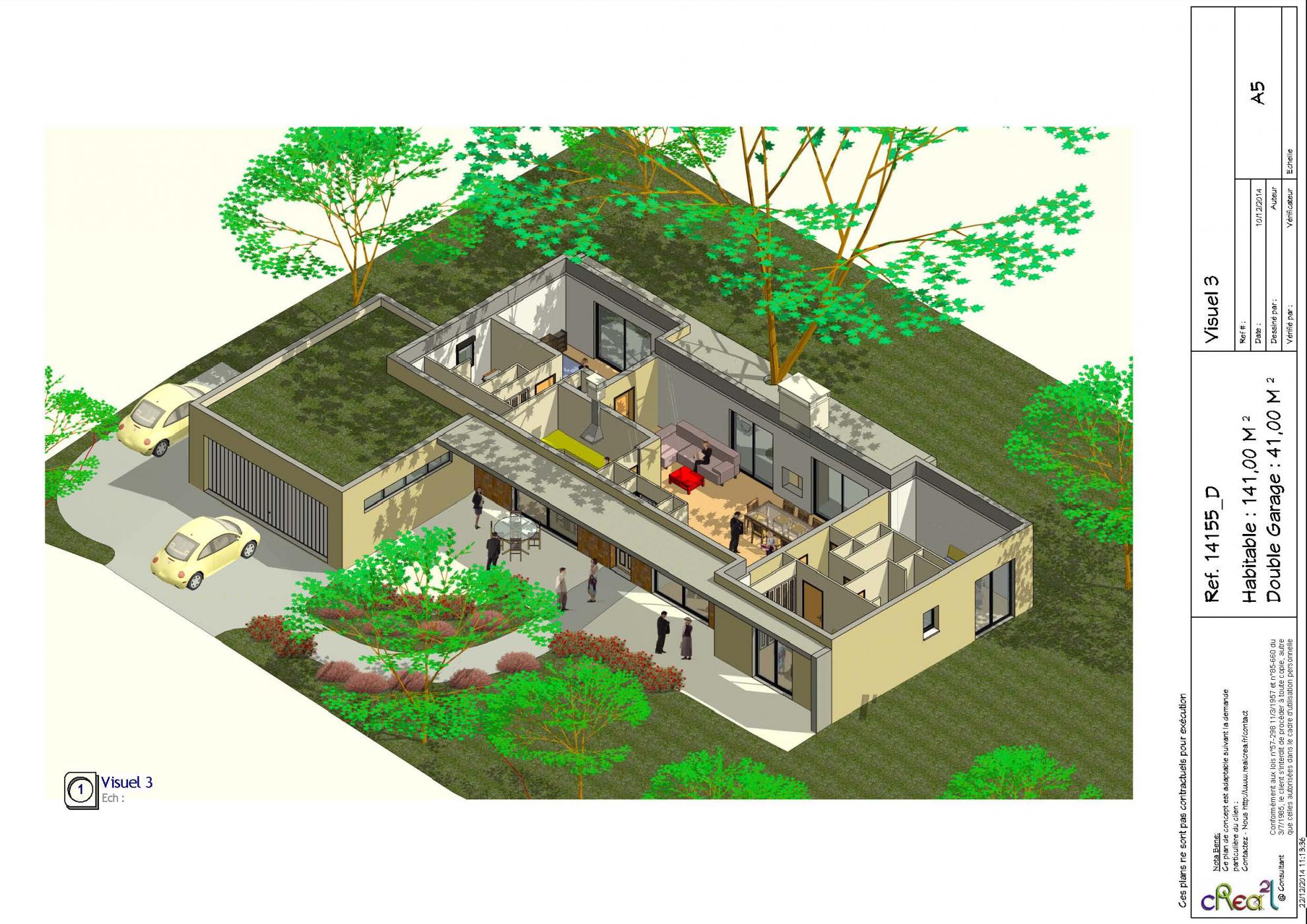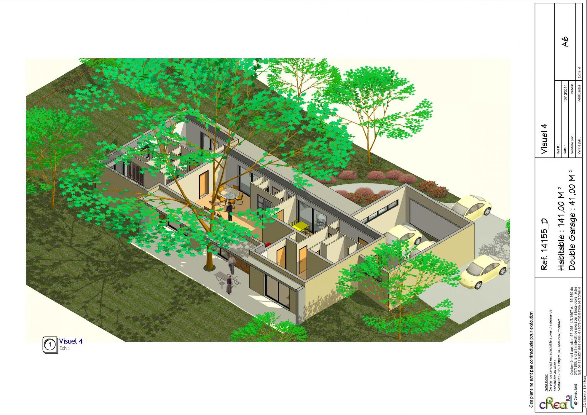Plan 14155_D : Maison plain pied contemporaine, T3, 140 M², 1 suite, 2 chambres, grand garage.