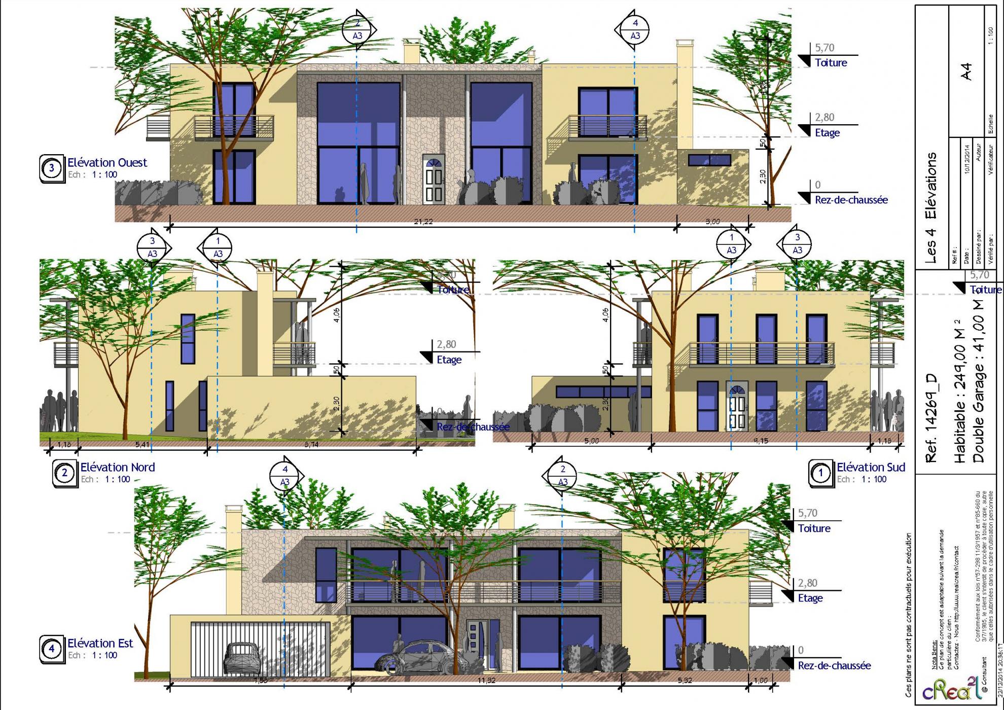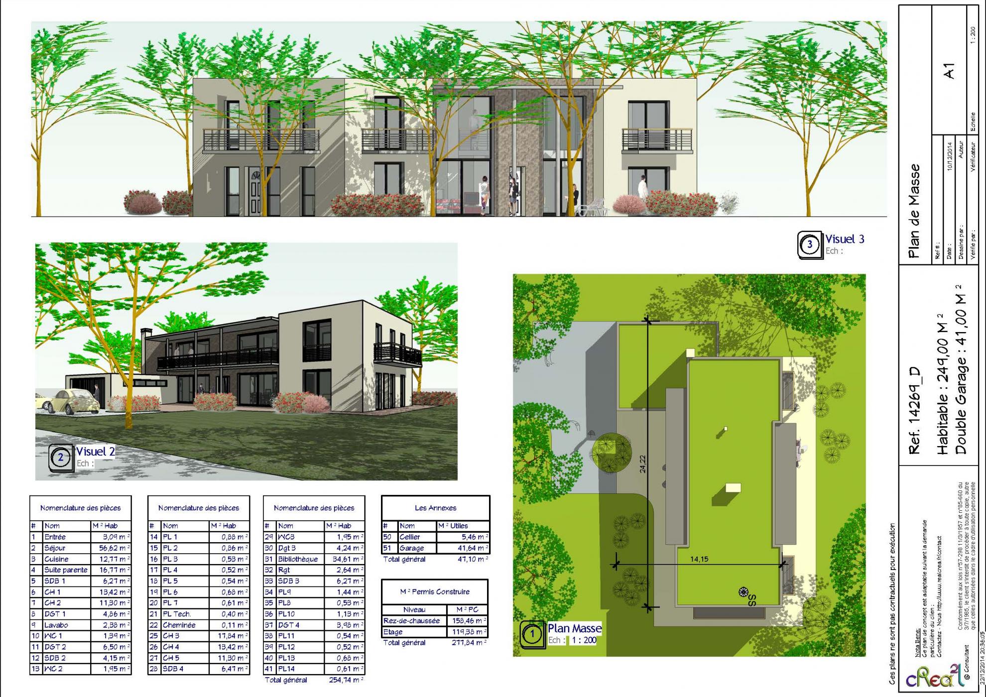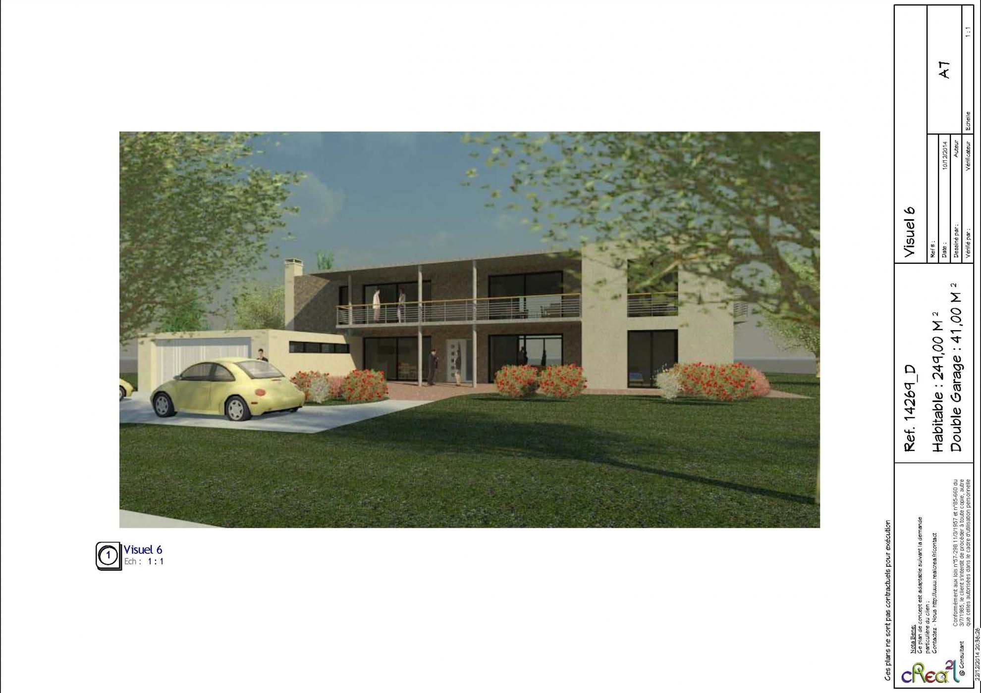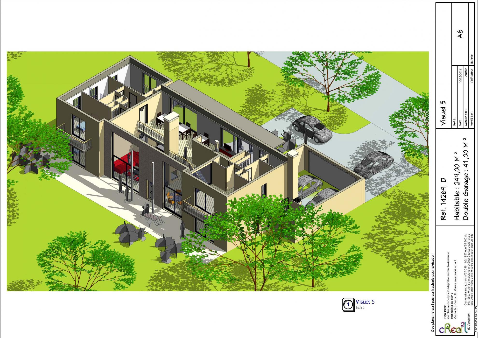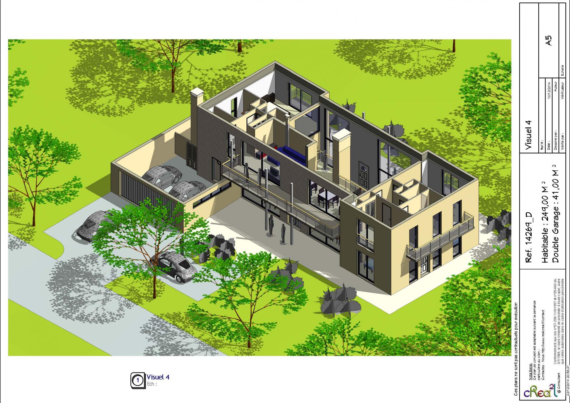 Plan 14269_D : Maison moderne R+1, T7, 240 M², Grand Garage intégré.