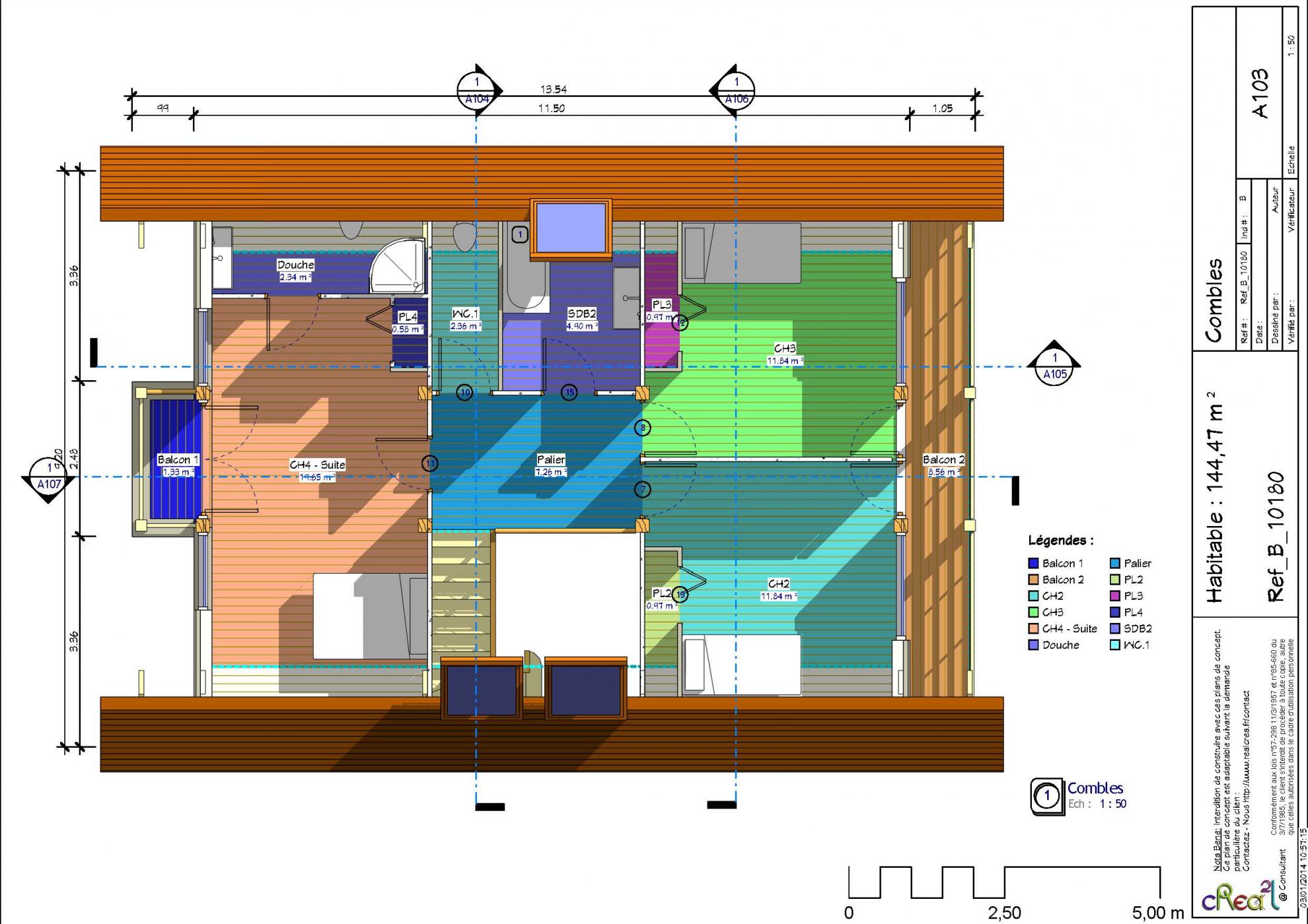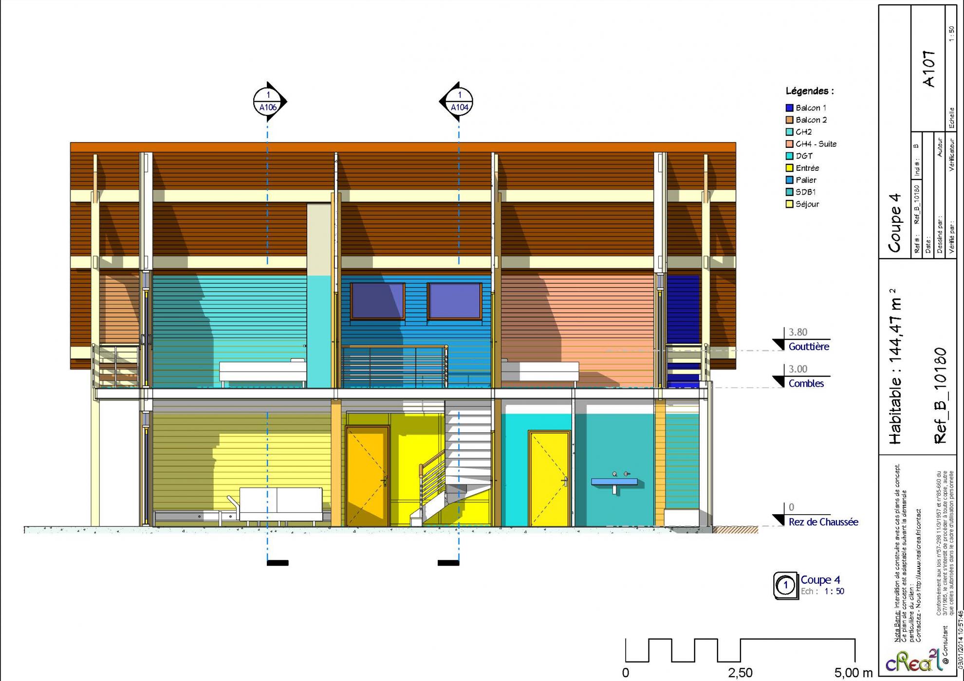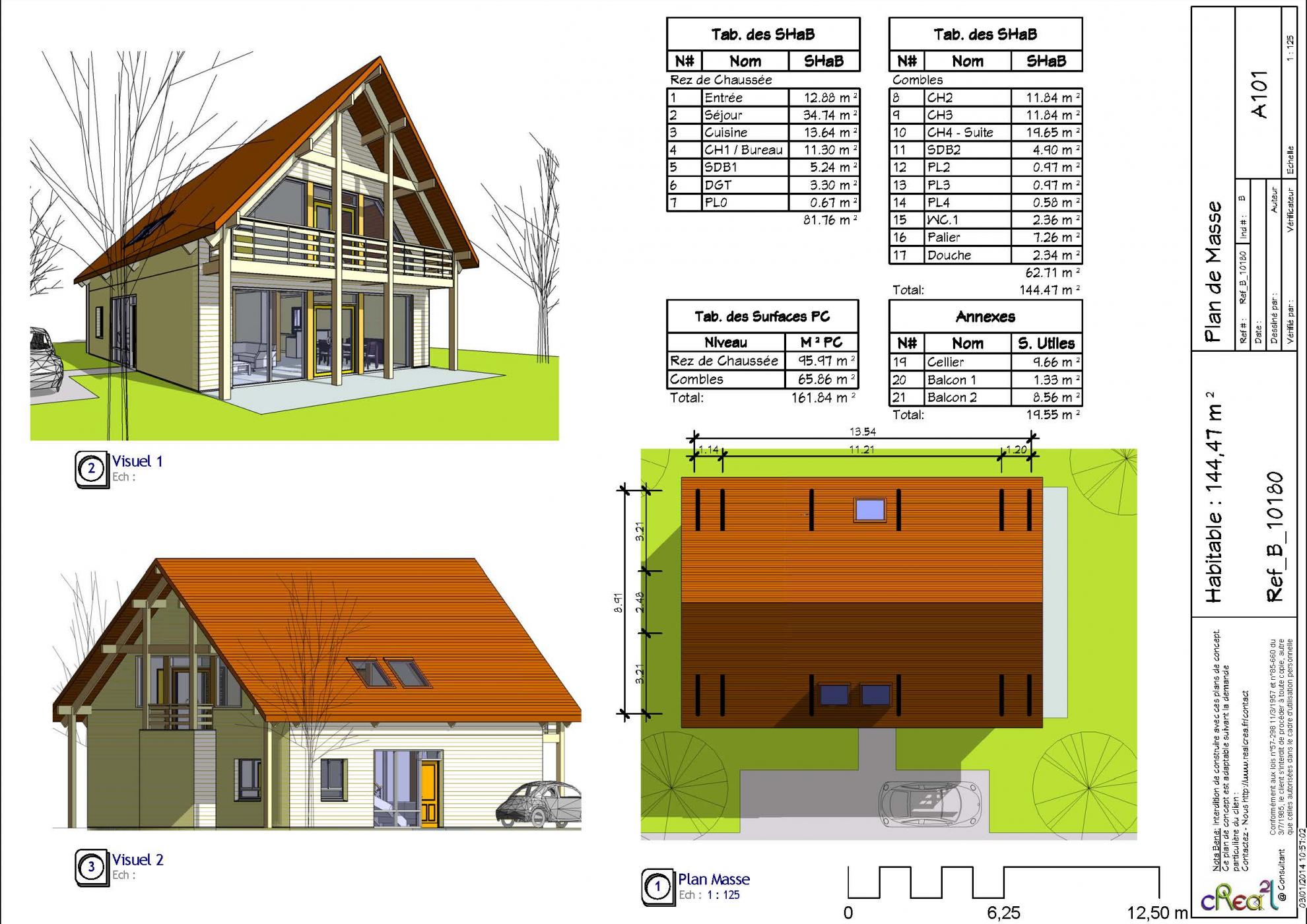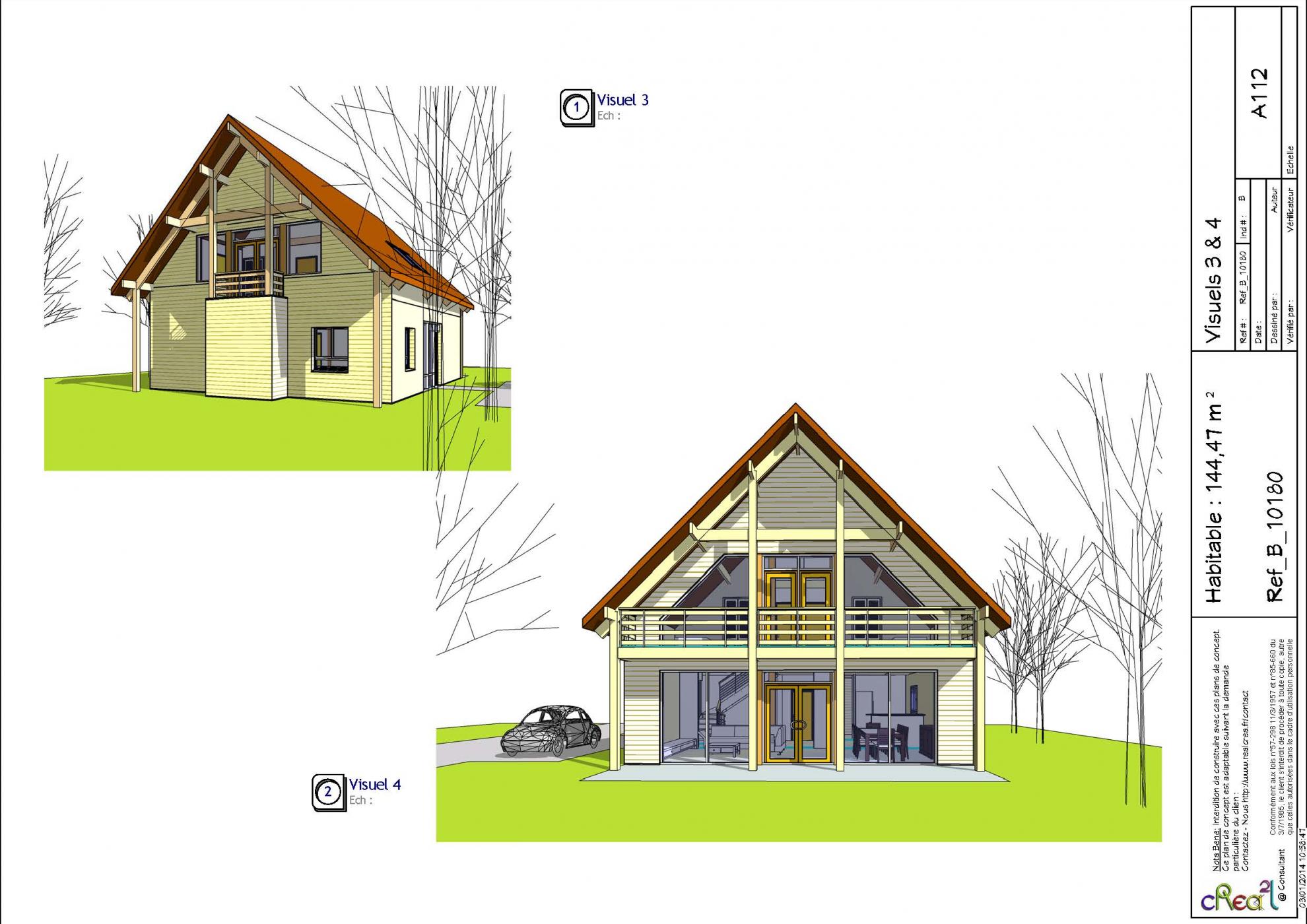 Plan B_10180 : Maison à ossature bois, R + Combles, 4 chambres ayant 154 m² habitables.