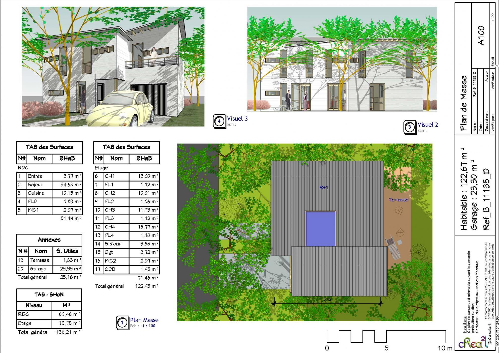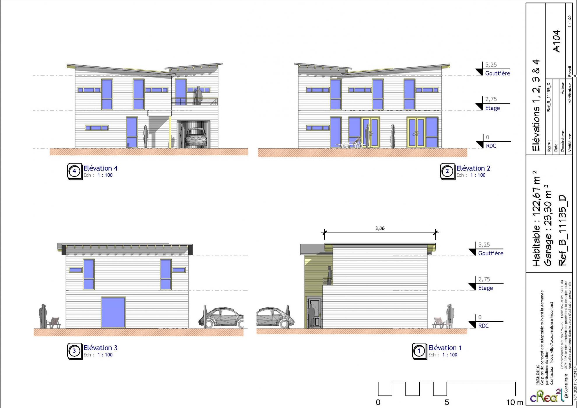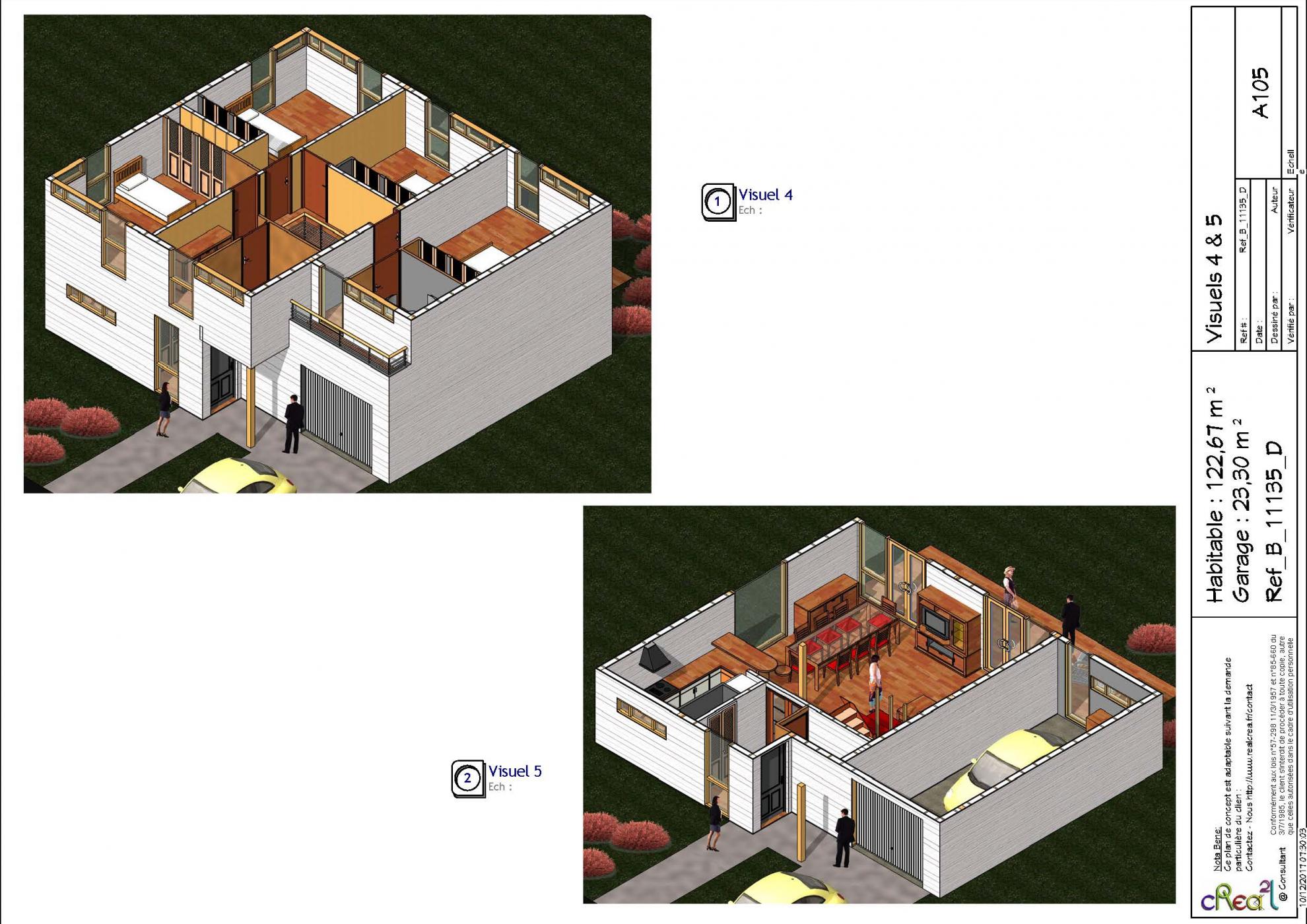 Plan B_11135_D : Maison contemporaine R + 1, 4 chambres ayant 122 m² habitables et garage intégré.