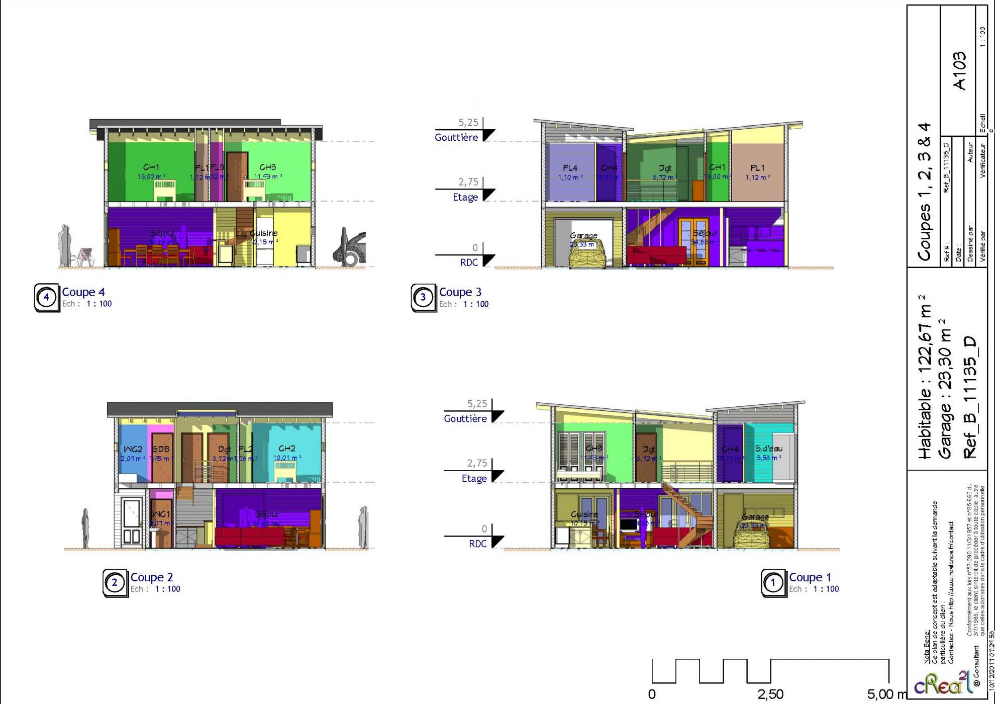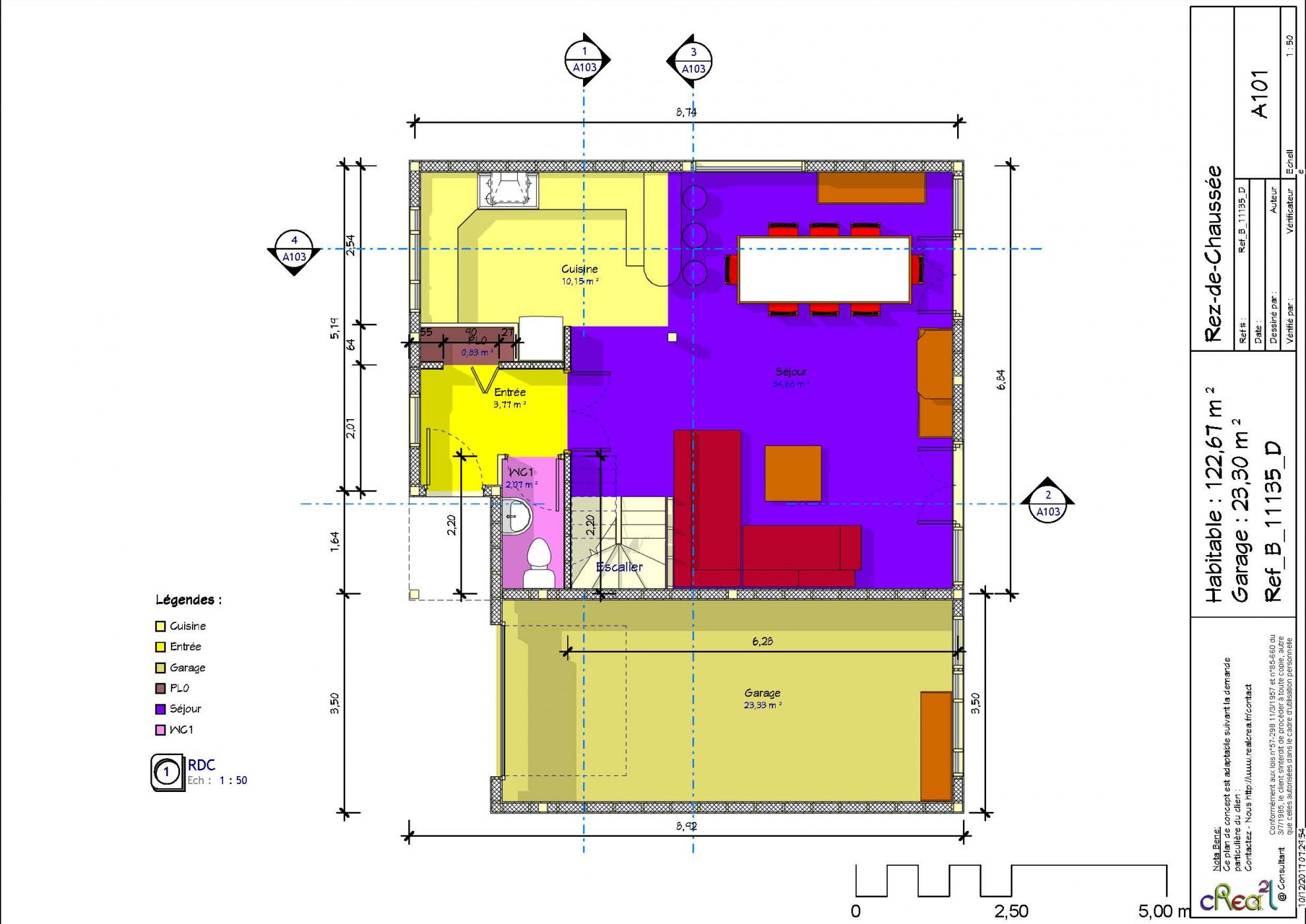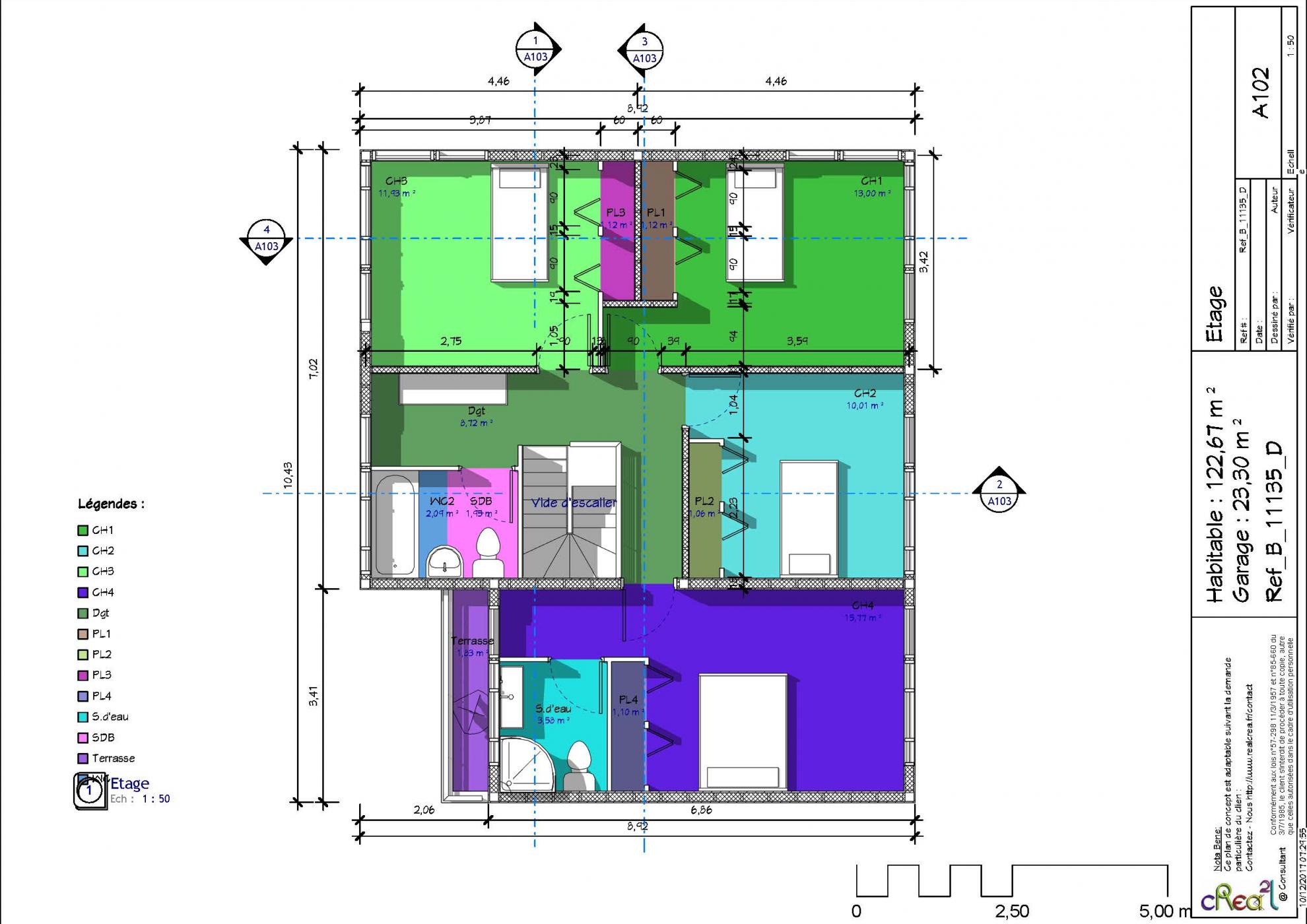 Plan B_11135_D : Maison contemporaine R + 1, 4 chambres ayant 122 m² habitables et garage intégré.