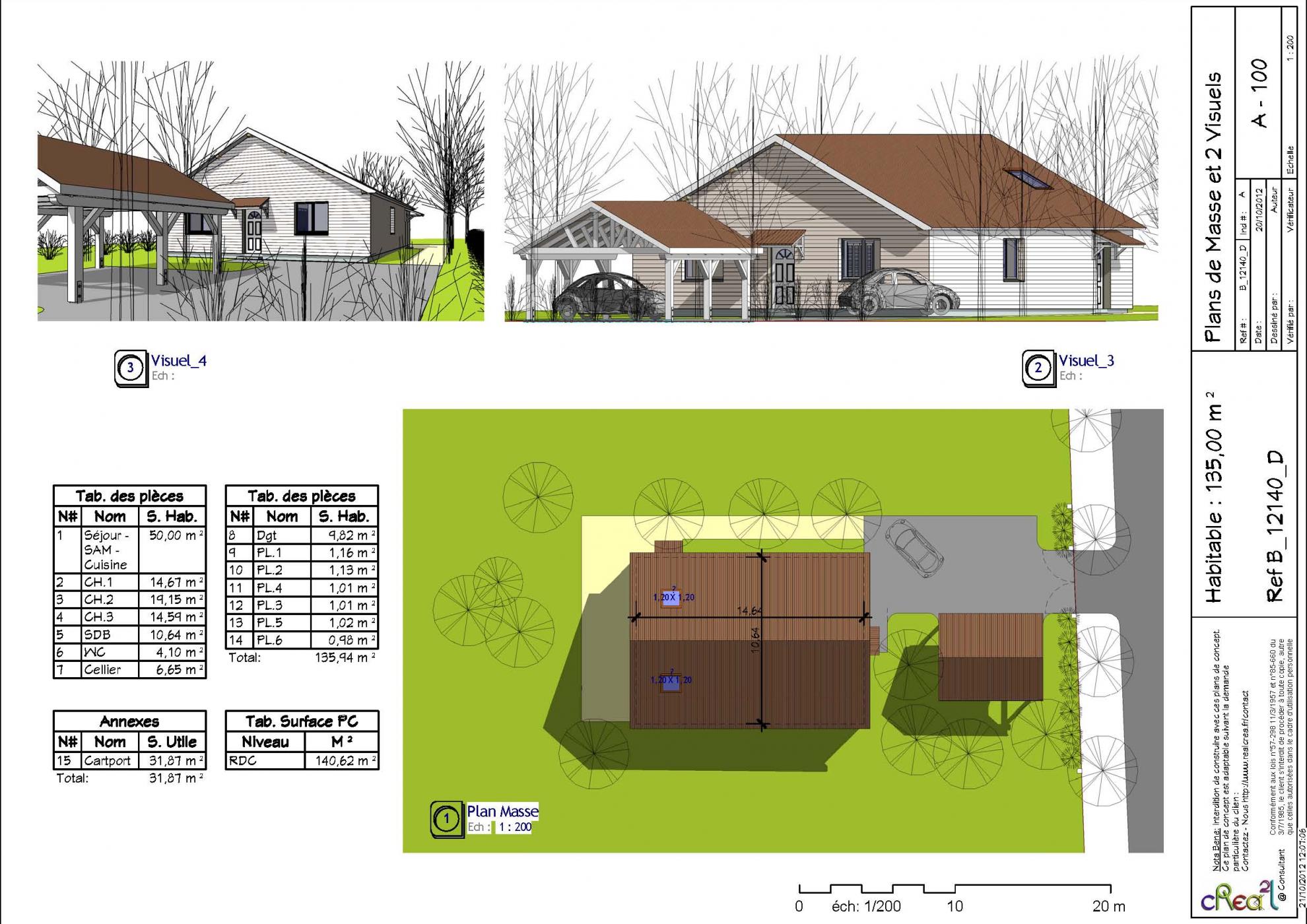 Plan B_12141_D : Maison en bois moderne, plain-pied, 3 chambres, 135 m² habitable avec grand carport 2 places.
