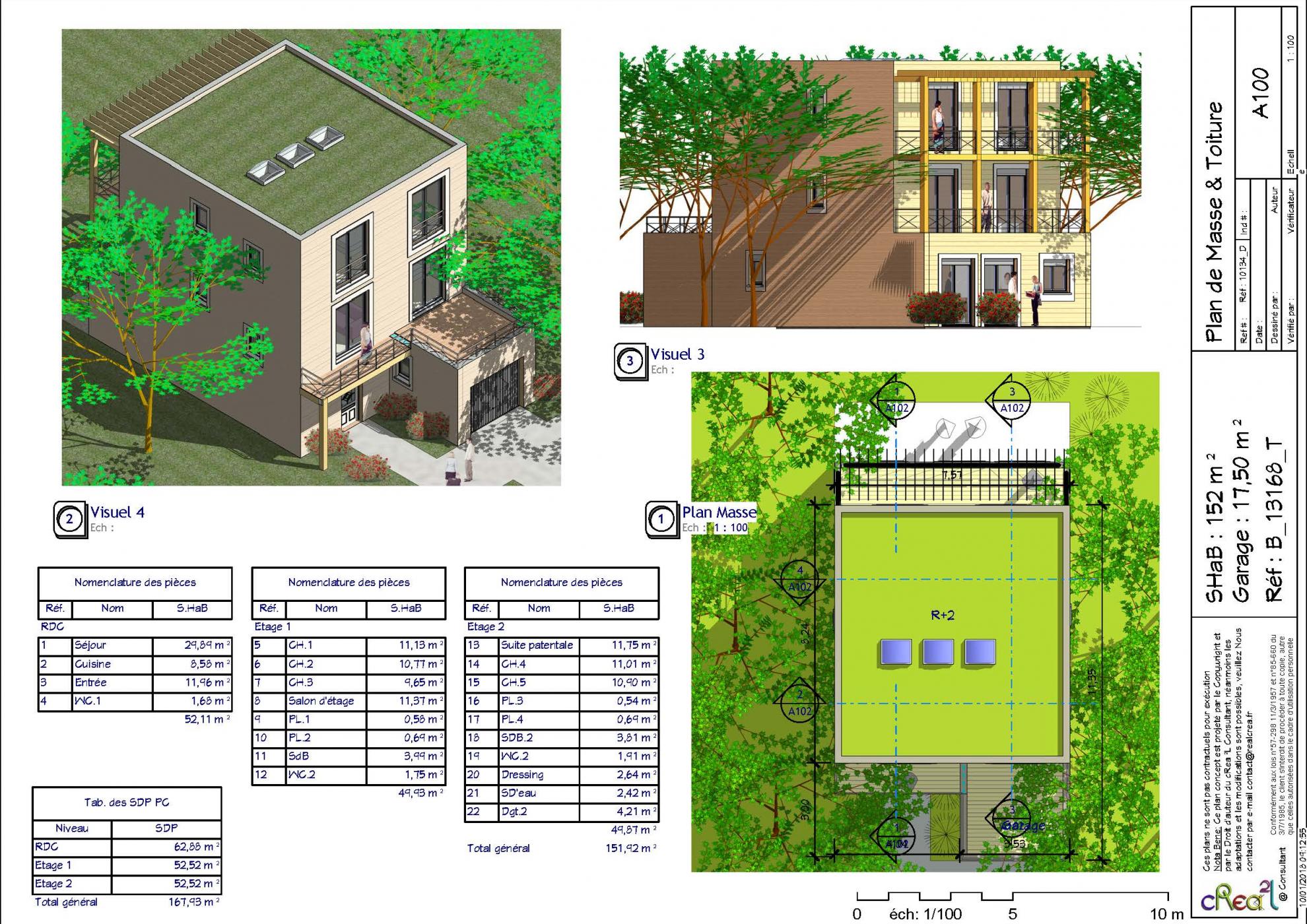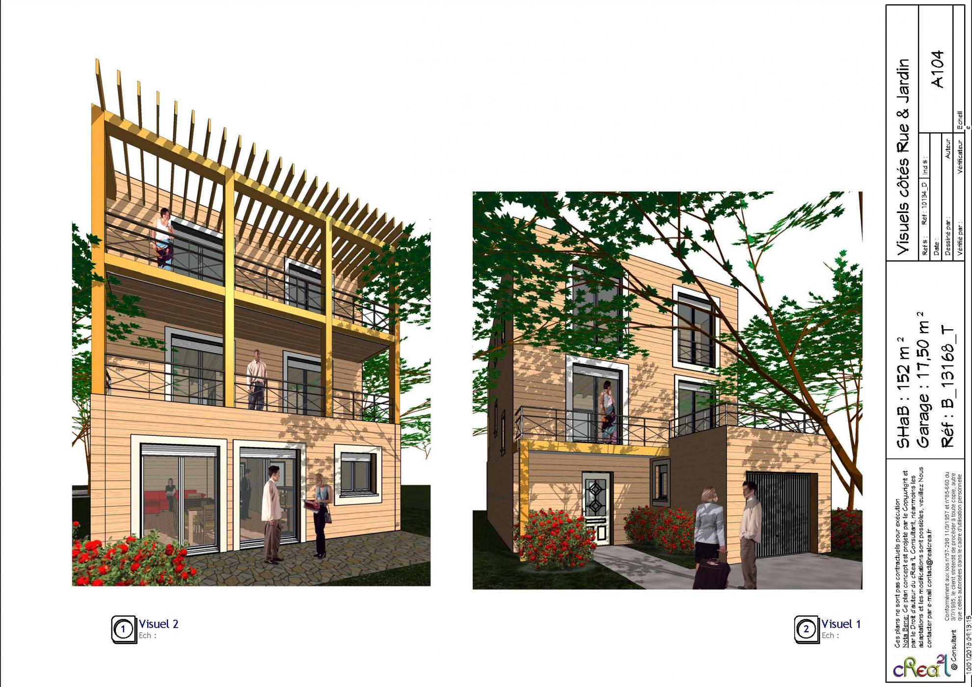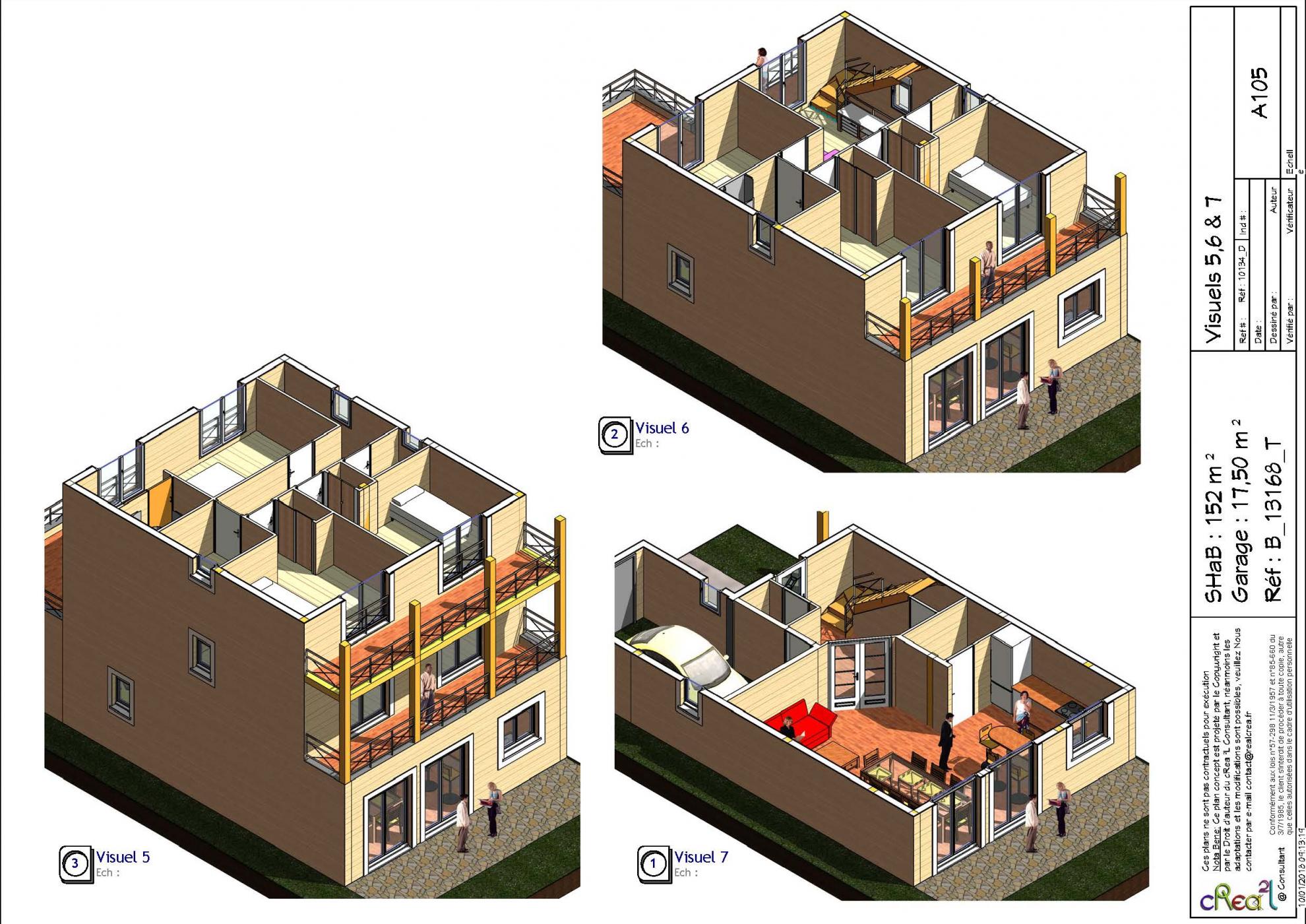 Plan B_13168_T : Maison bois R+2 de 152 M² habitables, 5 chambres, 1 suite, 1 garage intégré et toit plat.