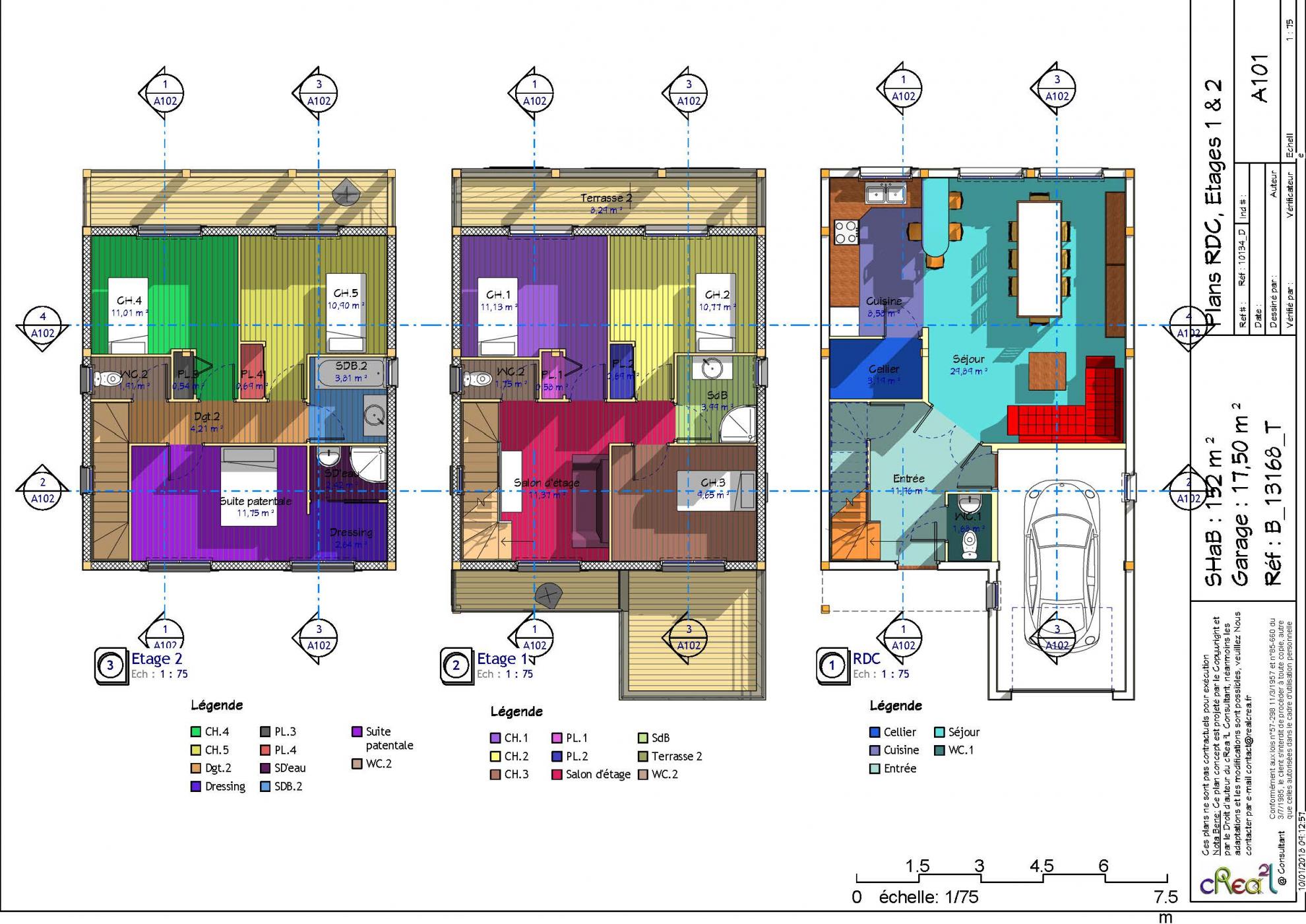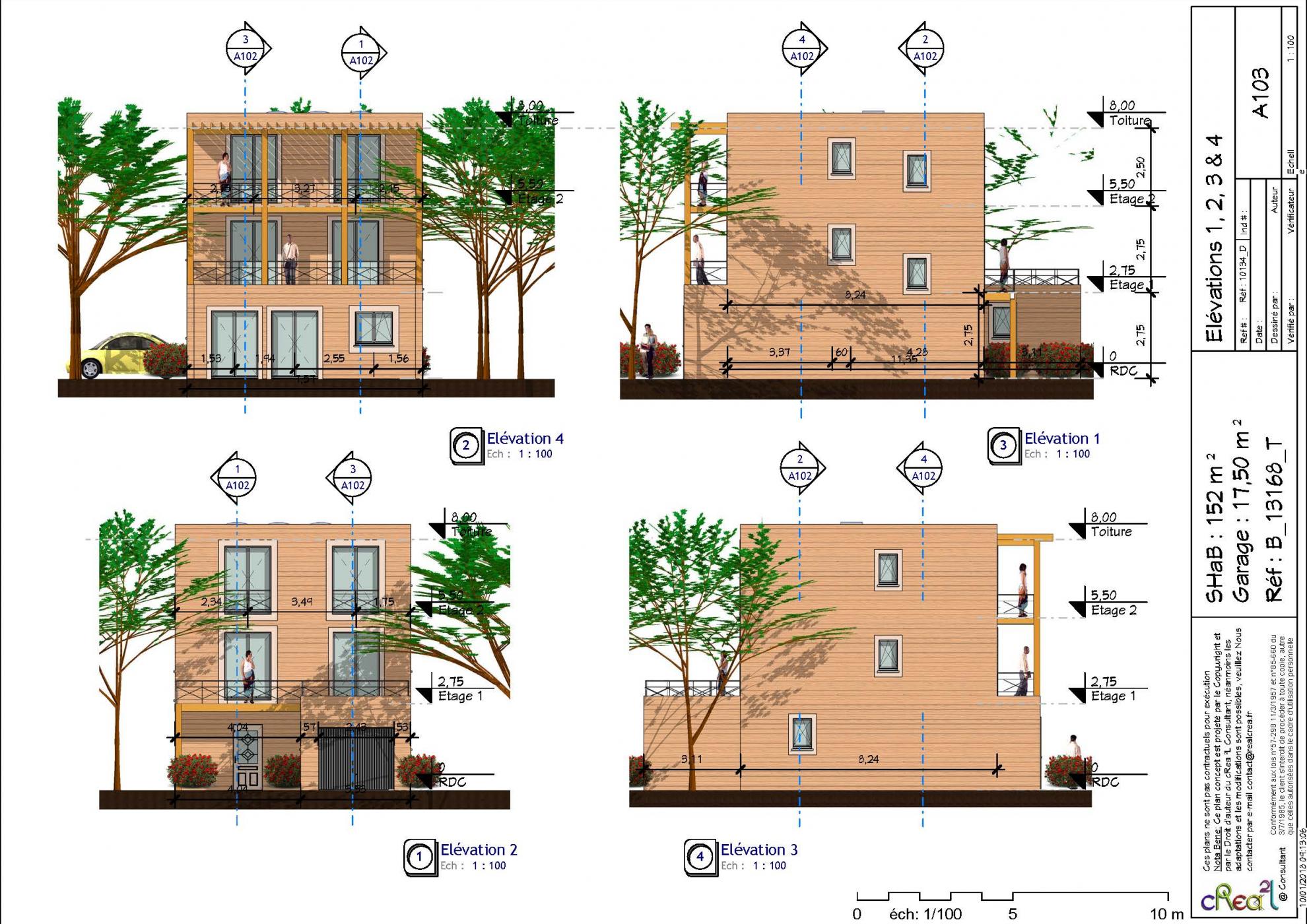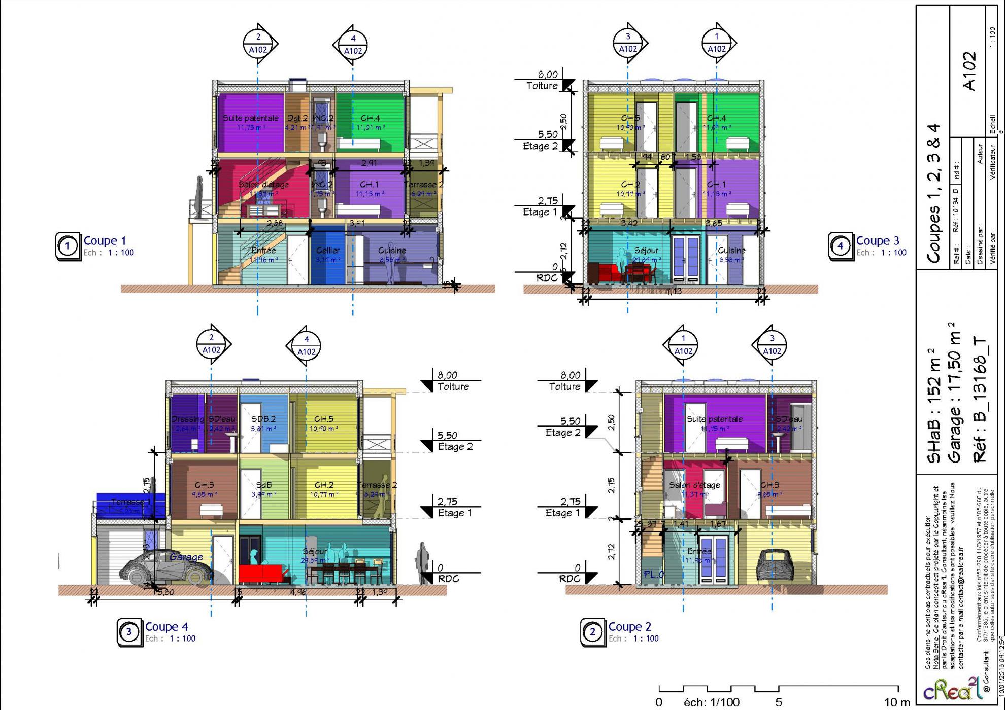 Plan B_13168_T : Maison bois R+2 de 152 M² habitables, 5 chambres, 1 suite, 1 garage intégré et toit plat.