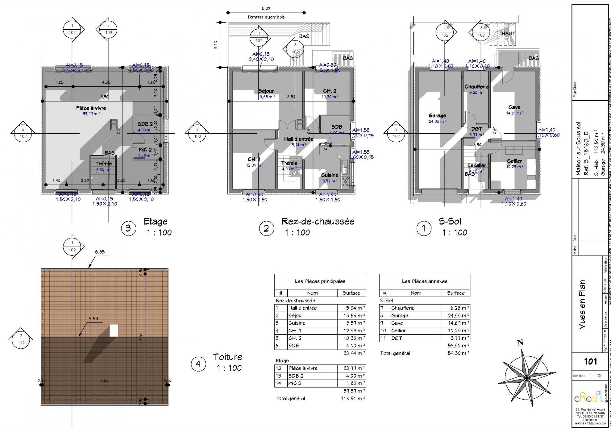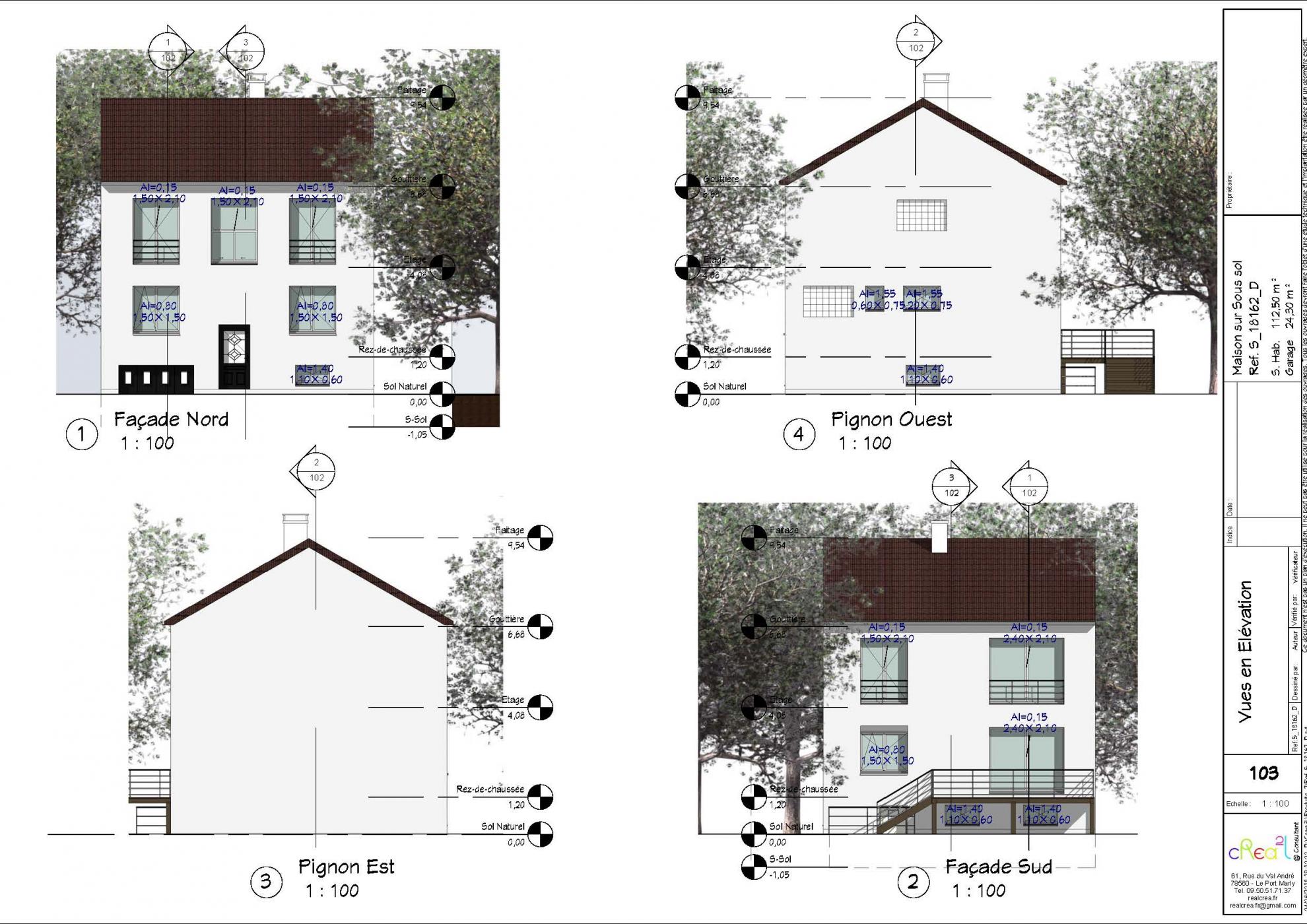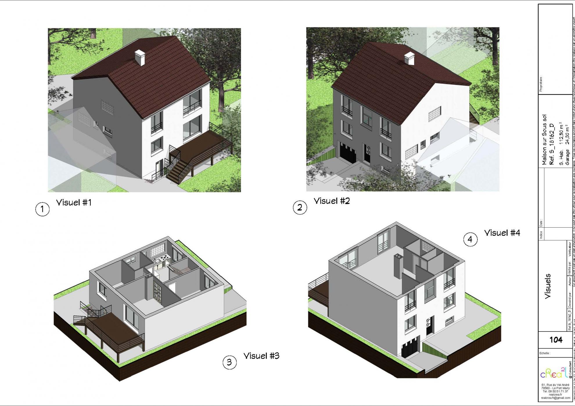 Plan S_18162_D : Maison contemporaine sur sous sol complet, R+1+S, 162 M², Taille T4 dont 1 Suite parentale en loft à étage, Grand garage en sous sol demie-enterré.